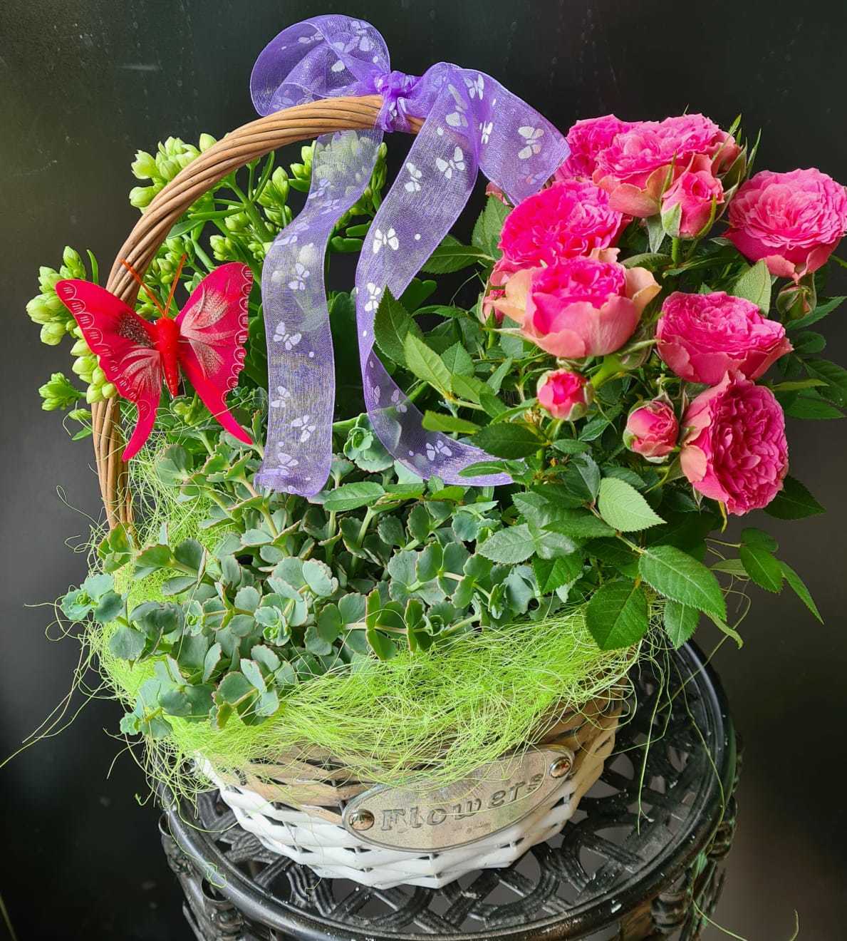 Aranjament plante in cos- kalanchoe, minirosa, sedum